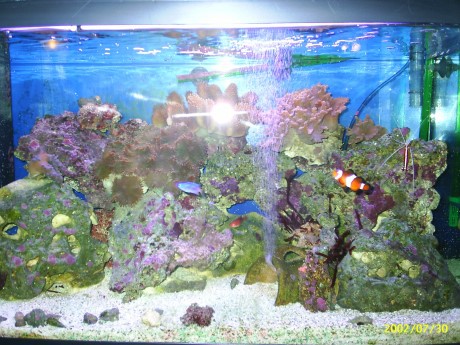 There was 15kg of live rock, and 3 fish, a clown fish, flasher wrasse and a Damsel. There were 5 types of coral of varying sizes, leather, yellow tip, mushroom, xenia, pink cauliflower, red bamboo and there were many other critters including a cleaner shrimp and 20+ snails and hermit crabs. The picture above really doesn’t do it justice.